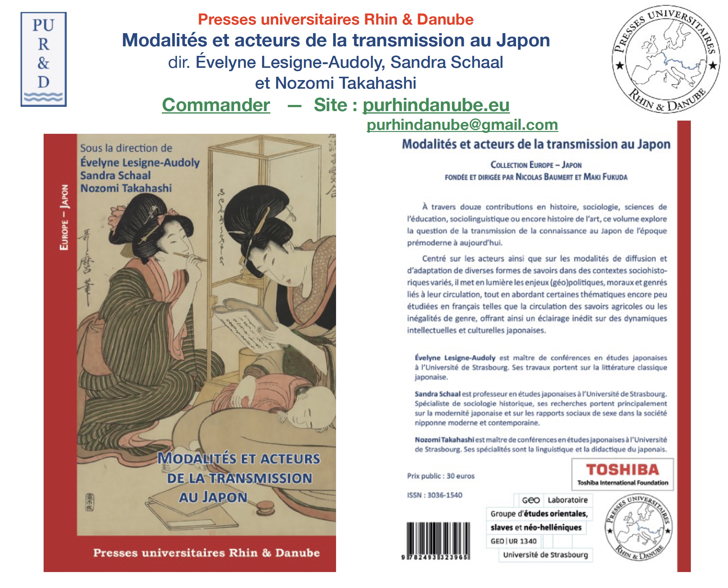 Évelyne Lesigne-Audoly, Sandra Schaal et Nozomi Takahashi ont le plaisir de vous annoncer la parution de l’ouvrage collectif qu’elles ont coordonné : Modalités et acteurs de la transmission au Japon, aux Presses universitaires Rhin & Danube. Cet ouvrage vient étoffer la collection Europe-Japon des Presses Universitaires Rhin & Danube, dirigée par Nicolas Baumert.